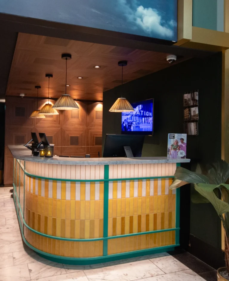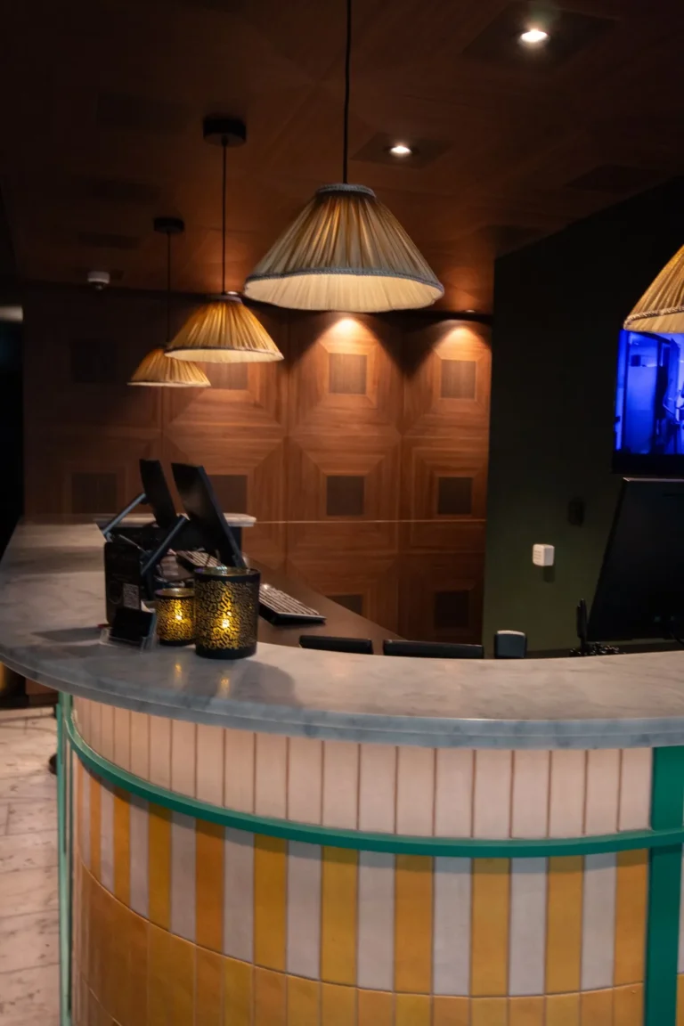 Achter de balie trekt de houten wand- en plafondafwerking direct de aandacht. De geometrische panelen geven de ruimte een warme en gelaagde uitstraling, en versterken de beleving bij binnenkomst. Deze combinatie van materialen en vormen creëert een uitnodigende sfeer, passend bij het karakter van een eigentijds stadshotel.