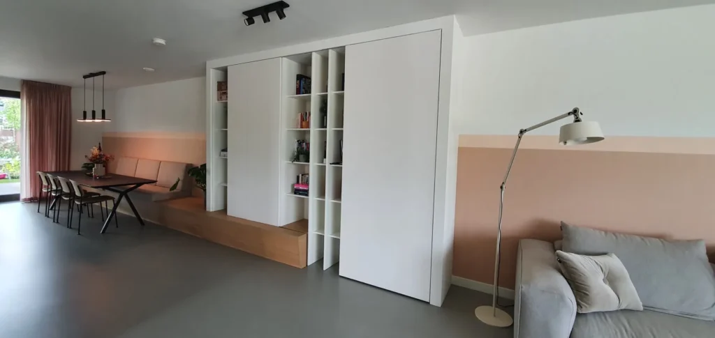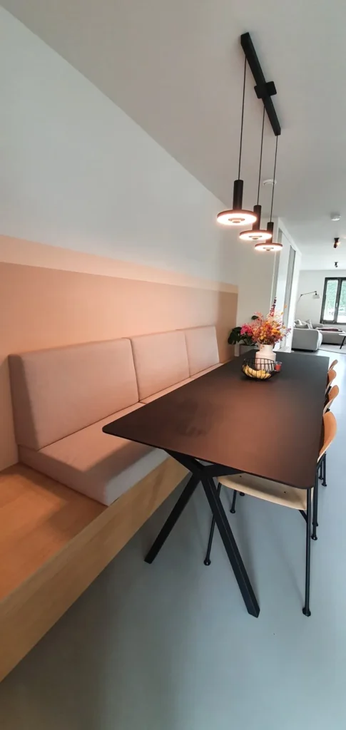 De op maat gemaakte vaste eettafelbank vormt het hart van de eetruimte. Door deze slim te integreren met de wand en vloer, ontstaat een ruimtelijk en strak geheel. De combinatie van lichte houttinten, zachte stoffering en aardse kleuren creëert een rustige en huiselijke sfeer. De zitbank loopt elegant over in de maatwerkkastenwand die niet alleen opbergruimte biedt, maar ook zorgt voor een naadloze overgang tussen eetgedeelte en woonkamer.