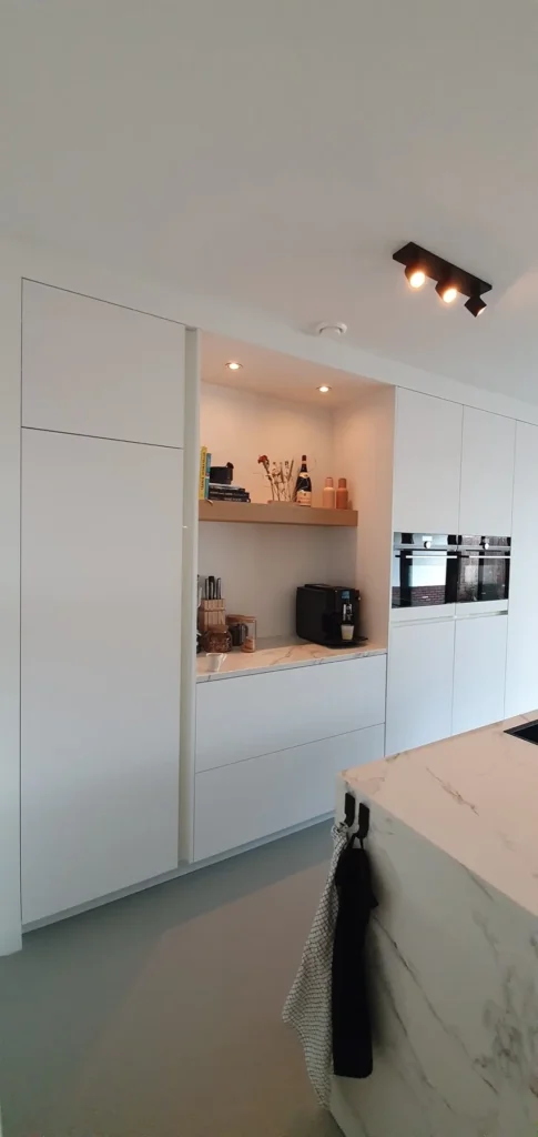 Ook de keuken is volledig op maat ontworpen. Het kookeiland met marmeren werkblad en ingebouwde opbergruimte zorgt voor een moderne, luxe uitstraling. Donkere accenten in combinatie met witte kastdelen geven het geheel een gebalanceerde en tijdloze look. Hier is duidelijk gekozen voor een hoog afwerkingsniveau, met aandacht voor elk detail.